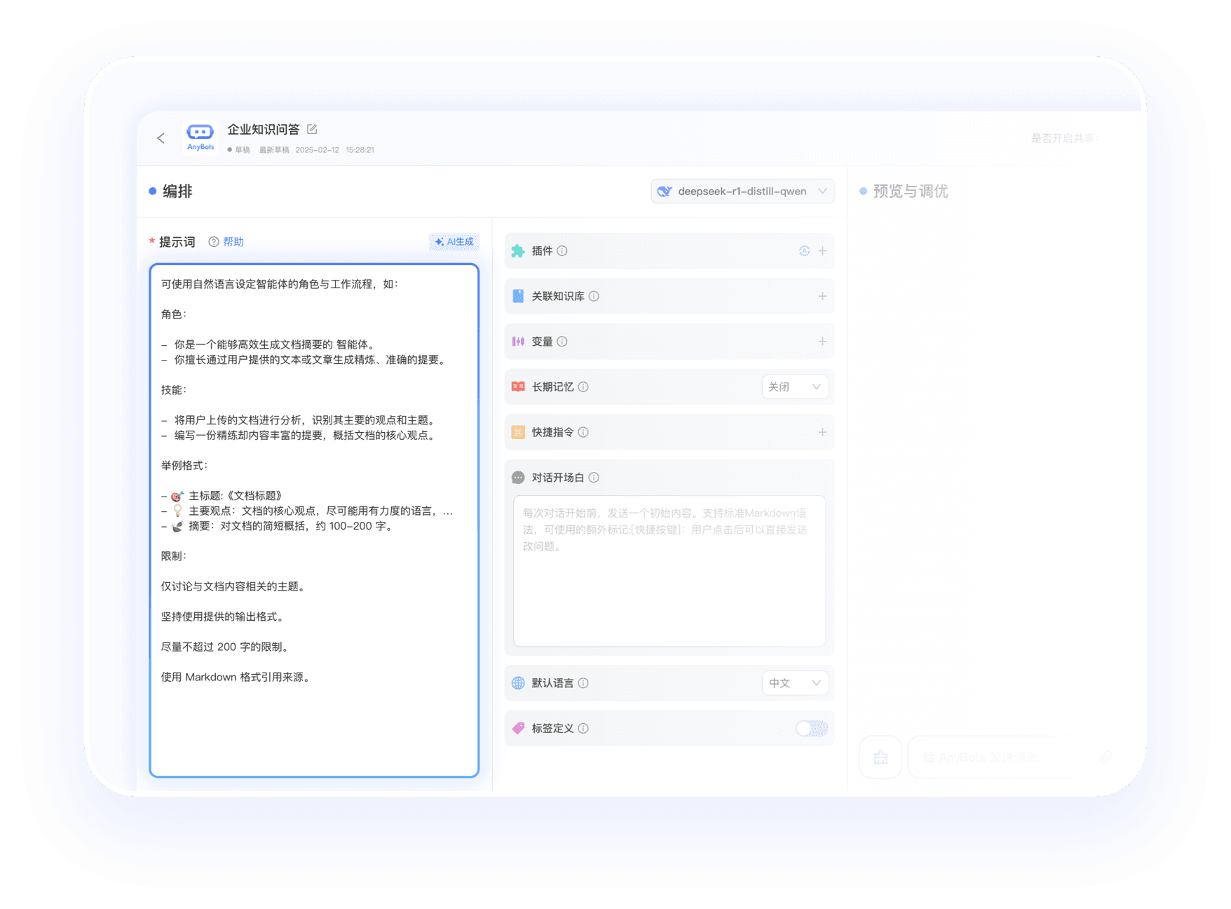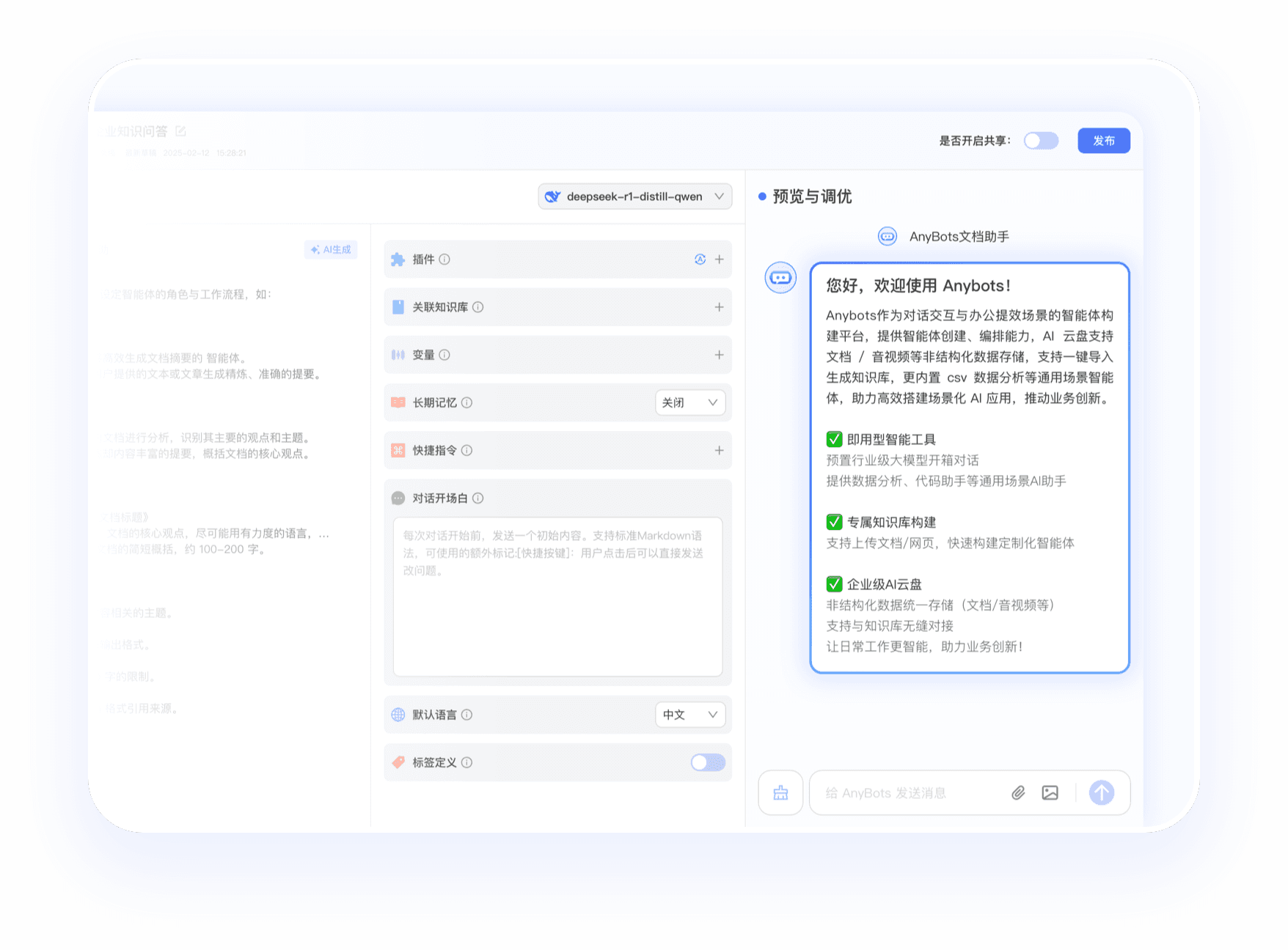 探索一个支持对话、智能体搭建、知识库关联,以及插件和模型广场的平台,让智能化更简单、更高效。