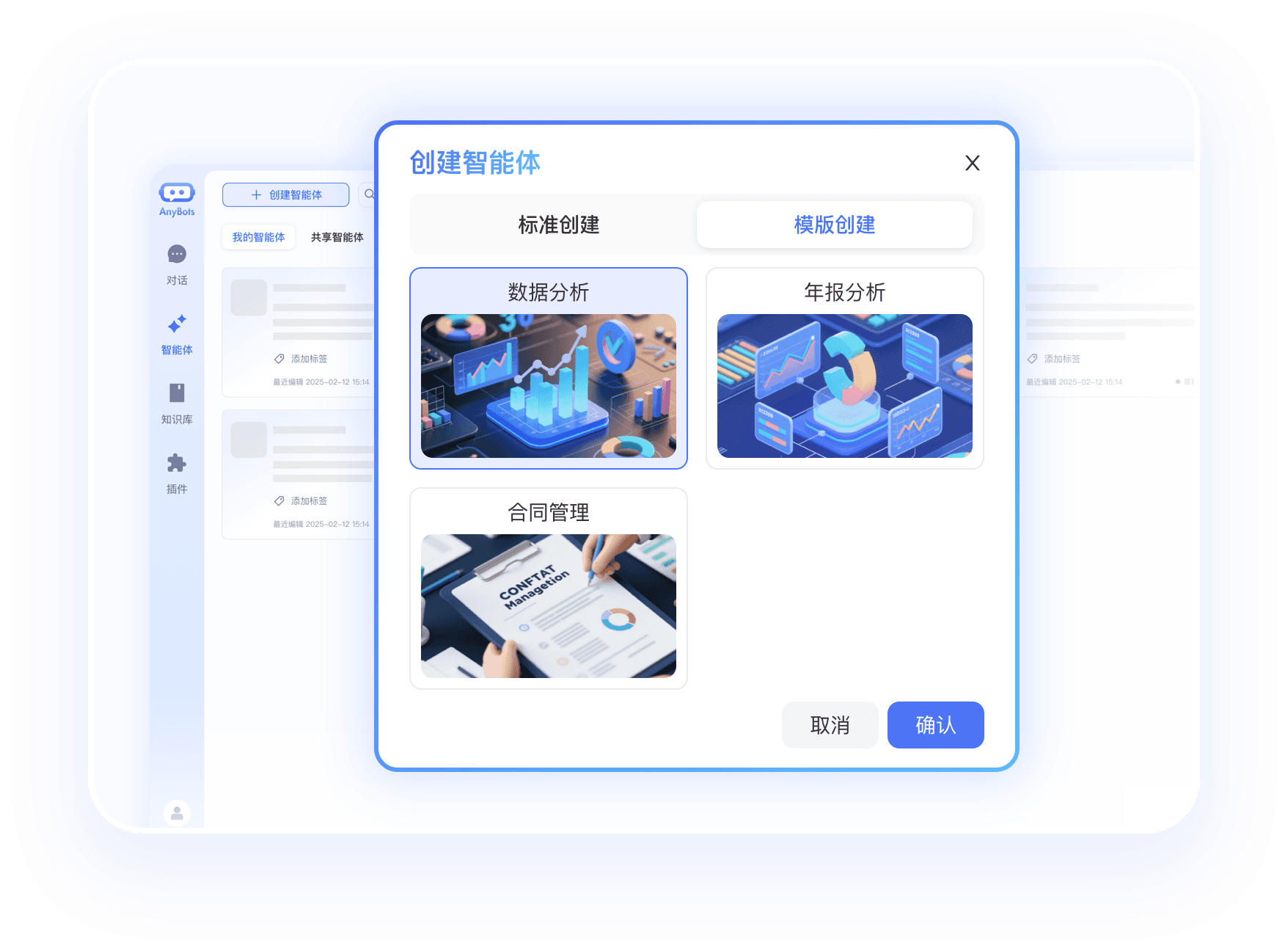 选择通用场景、数据分析等场景的智能体模板快速创建,接入企业数据秒级生成专属应用,零配置开箱即用