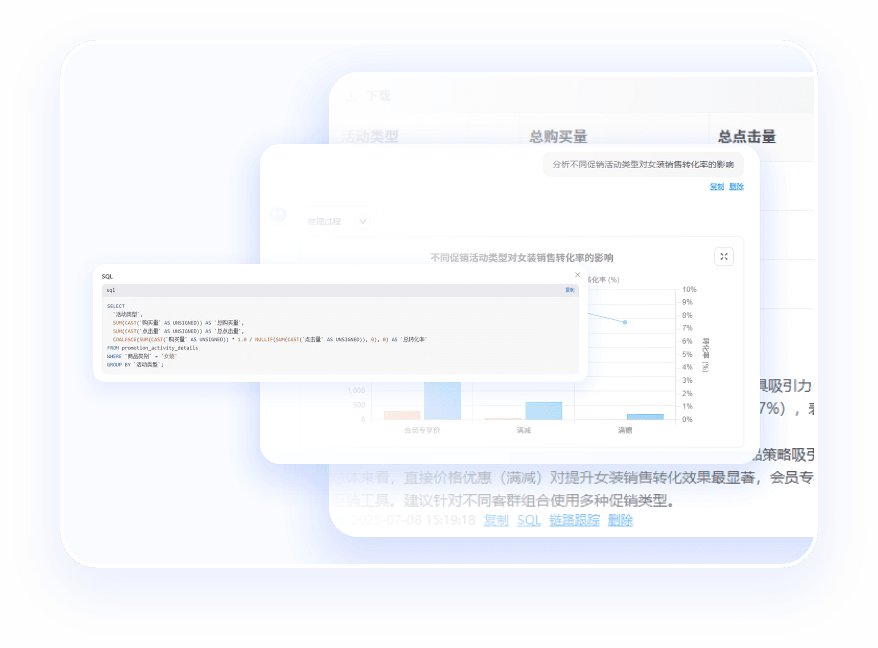 支持CSV和主流数据库接入,智能生成专属分析助手。用户通过自然语言即可生成SQL查询数据、生成报表、分析趋势。结合业务字段语义和术语理解,精准匹配数据意图,并以图表形式可视化呈现结果。集成主流 BI 工具,实现数据分析到可视化决策的闭环,助力企业高效实现智能化运营。